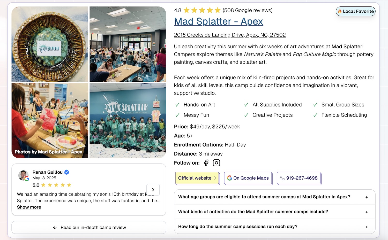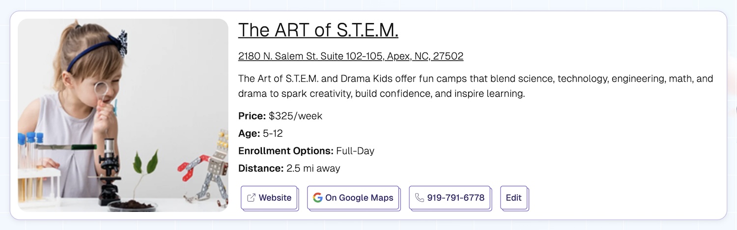 Featured listings get top spots, ensuring your organization stands out to parents browsing for programs across the Triangle area.