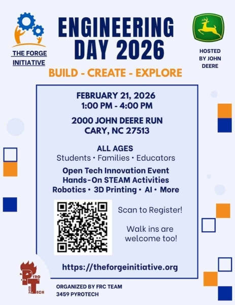 Unleash your inner engineer at the 9th annual Engineering Day, a FREE, all-ages, hands-on STEAM extravaganza hosted by The Forge Initiative! On February 21, 2026, from 1:00 PM to 4:00 PM, join us at John Deere (2000 John Deere Run, Cary, North Carolina) for an afternoon of interactive exploration and discovery. Dive into the exciting world of engineering with captivating activities showcasing robotics, 3D printing, artificial intelligence, and more. Whether you're a budding scientist or simply curious about STEM, Engineering Day offers something for everyone. Spark your imagination, foster creativity, and experience the thrill of hands-on learning in a fun and engaging environment. This event is designed to make engineering accessible to all, regardless of experience. Don't miss this opportunity to ignite a passion for STEM and explore the endless possibilities of engineering. Walk-ins are welcome, but we encourage you to register in advance to secure your spot. Join us for an unforgettable day of innovation and inspiration!