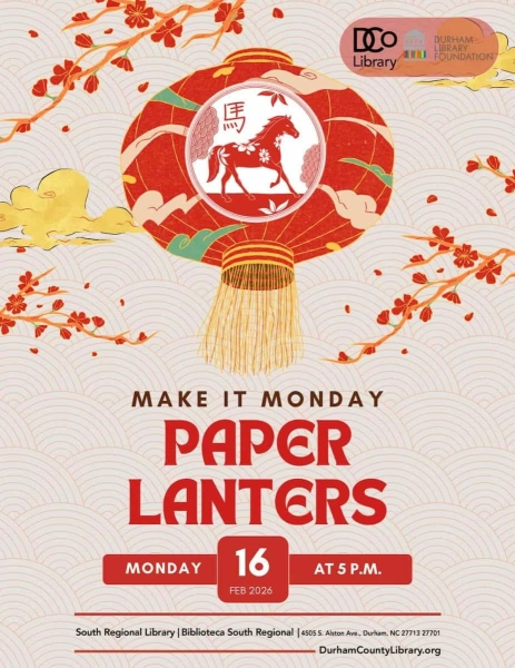 Celebrate the Lunar New Year with a burst of creativity at our "Make It Monday! Paper Lanterns" event! Durham County Library invites young artists ages 7-14 to join us for an exciting crafting session where you'll learn to use the Cricut cutting machine to craft vibrant and beautiful paper lanterns. This is the perfect way to honor the Chinese Lunar New Year and welcome the Year of the Horse with your own handmade decorations. This free event takes place on Monday, February 16, 2026, from 5 to 6 p.m. at the South Regional Library (4505 S Alston Avenue, Durham, NC). Be sure to arrive on time to secure your supplies and make the most of this unique crafting opportunity. Space is limited, and registration is required to participate. Don't miss out on this chance to learn a new skill and create a stunning lantern to celebrate the Lunar New Year. Register today and prepare to illuminate your celebrations!