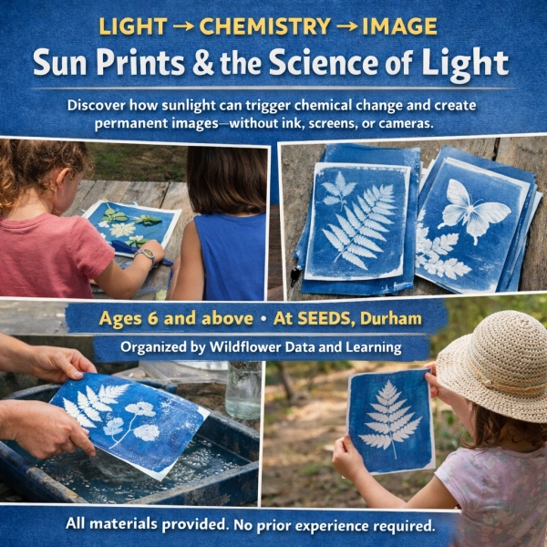 Light -> Chemistry -> Image! Fun, kids workshop where science meets art! Explore how sunlight changes matter in this hands-on cyanotype workshopβdesign, experiment, and create lasting blue sun prints. For kids ages 6 and above π SEEDS, Durham ποΈ February 14 β° 2:30 - 4:00 PM ποΈ Tickets: https://tinyurl.tools/15777c59